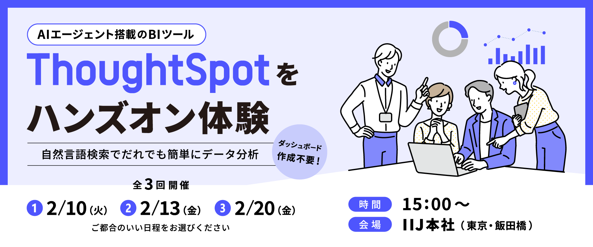 | 15:00-16:30 | ・講師挨拶・プログラム内容ご紹介(10分) ・IIJの取り組みをご紹介(15分) ・ThoughtSpotハンズオンセッション+Q&A(60分) ・アンケート回答(5分) |